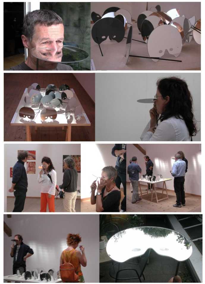 Exposant à Vinelz, entre les 3 lacs, en plein "Seeland", autrefois Grand-marais, il m'a paru indiqué d'évoquer la surface miroitante de l'eau, si attirante, si marquante… et tout autant frontière entre deux mondes. Au moyen de ce petit objet à la forme inattendue et ergonomique, on peut s'amuser à voir à la fois dessus et dessous et se laisser surprendre par ces collisions de points de vue. Cela permet aussi de nous rappeler que nous sommes habitants de surface, comme ces batraciens nombreux ici, et qui mettent à profit cette perspective pour leur survie.