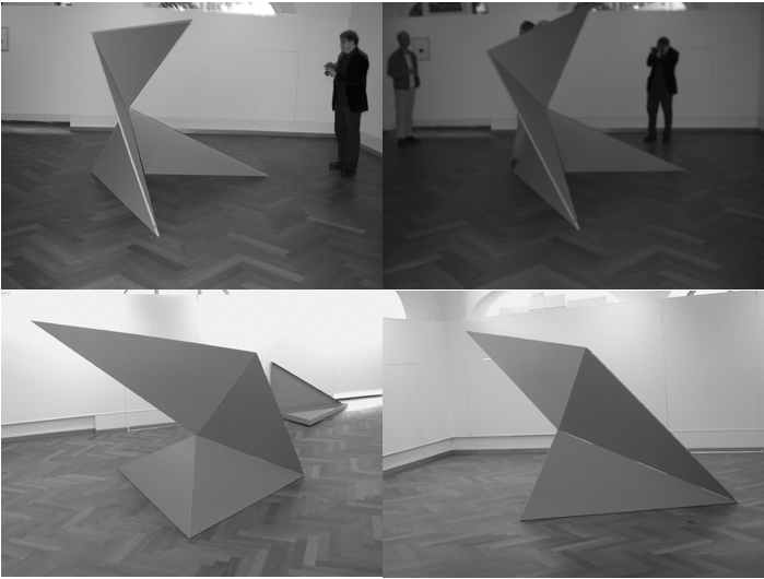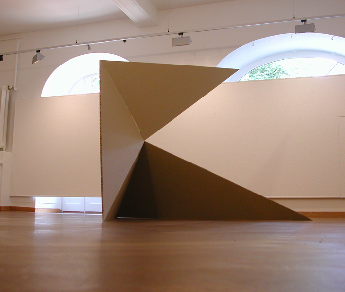 Le 10 juin 2008 (Joli mois de mai). Comme un musicien de rue, j’arrive (quand le public est déjà là, étonné de ne rien trouver…), je pose mon étui dans un coin de la salle, en sort un paquet de formes triangulaires en carton. En moins d’une demi-minute, je pose, ouvre et déplie, déploie la sculpture. De par le poids, les angulations et orientations des formes, l’ensemble tient debout, relativement stable, sans aucun autre moyen de fixation. Le démontage ne prend pas plus de temps. Durant la soirée, quelques pièces ont été déposées dans l’étui resté en place.