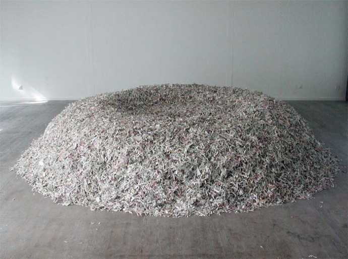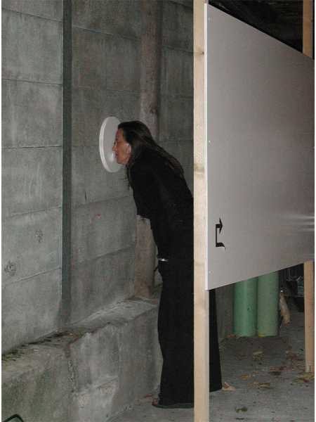 Ce malaise d‘observateur sous-tend les deux parties de COCOON: dans le pavillon, une forme de nid, grande, belle et accueillante (au point que certains n‘ont pu se retenir d‘y sauter), sculpture“ presque classique au premier abord. Le trouble vient du matériau employé, de sa provenance: 400kg de dossiers confidentiels, soigneusement transformés (sous surveillance officielle) en gros confettis, et fournis par l‘office des oeuvres sociales de la ville de Berne. Petits morceaux de papier déchiré inoffensifs qui nous renvoient par leur (ex)contenu possible au monde parallèle de l‘autre côté du mur, la probabilité étant grande que certains de ces dossiers traitaient de morceaux de vie de clients de „Contact“.