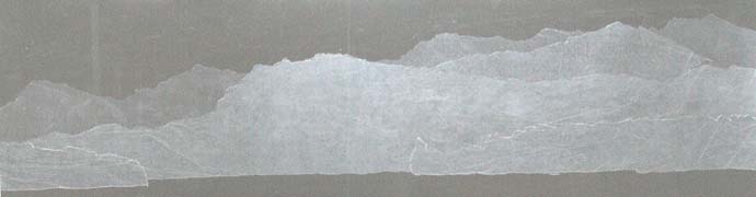 Bien que l’artiste ne recoure ni à la mine ni au papier, c’est pourtant bel et bien de dessin qu’il s’agit dans « Nationalquai Panorama », ou tout au moins de lignes, qui dessinent le panorama environnant la ville de Lucerne. Un site photographié, reproduit un nombre incalculable de fois. Philippe Hinderling en propose lui, à Lucerne même, et sous le panorama Bourbaki bien connu, une version toute personnelle. Au moyen d’un matériau quotidien, mais à première vue rédhibitoire, un feuil de plastique plaqué directement sur le vitrage d’entrée de l’exposition, l’artiste évoque les différents plans et structures qui construisent le paysage. Malgré l’usage fait de ce matériau fragile, qui vient imperceptiblement contredire ses qualités intrinsèques - transparence, quasi immatérialité et aspect bidimensionnel subtilement s’annulent dans les plis du plastique -, l’œuvre reste discrète dans sa matérialité.