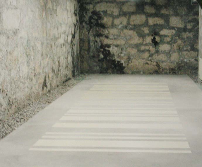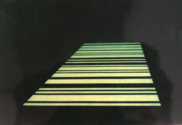 Description: un ensemble de lames sont déposées sur le sol (8p. de 200x30cm et 12p. de 200x10cm), formant une écriture (code-barre 3 9), signifiant LOVE, d'une longueur totale d'environs 7m. Ces lames en tôle sont enduites d'une peinture phosphorescente, restituent donc la lumière dans la nuit. Le tout est vivement éclairé, mais les lampes s'éteignent si quelqu'un pénètre la zone de l'écriture. Celle-ci devient alors le seul élément visible, luisant doucement, avant de s'effacer petit à petit.