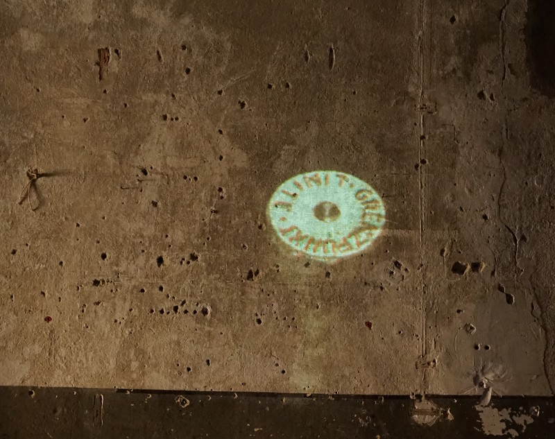 En projection (et en 3D), directement sur le mur, on voit une curieuse forme, un peu brillante. Avec une manette on peut la manipuler, la tourner dans tous les sens. Sur une des faces, on peut lire GRENZPUNKT LIMITE. C'est un point de marquage du cadastre de la ville de Bienne. Cet objet a été scanné et traité en 3D. Les lunettes d'approche à disposition, qui permettent donc de surveiller la frontière, font aussi office de lunettes 3D.