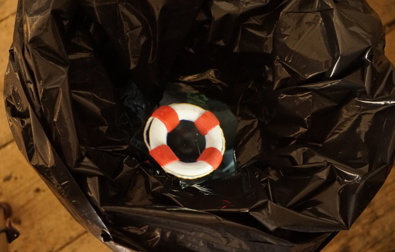 Dans l'autre, semblant flotter au dessus de l'eau, une bouée de sauvetage.