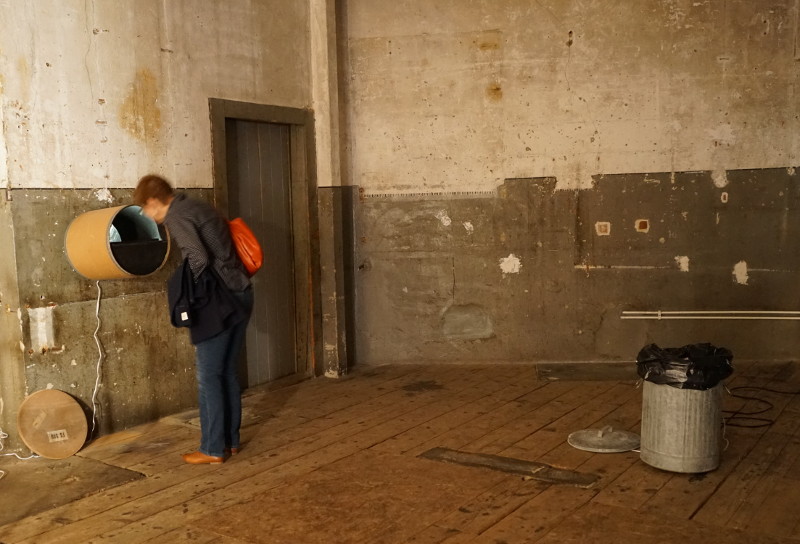 Un des cylindres est au mur, l'autre, une poubelle, posé au sol (à l'intérieur, au fond des cylindres, il y a un miroir concave et ce petit espace est éclairé. Dans la poubelle, il y a en plus de l'eau).