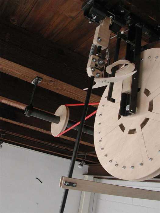 Un mouvement d'horloge (sans cadrans ni aiguilles), fabriqué avec des moyens très simples est rythmé par un balancier-balançoire et une ancre dont le bruit est très audible. Le rythme des battements est d'une seconde approximativement.