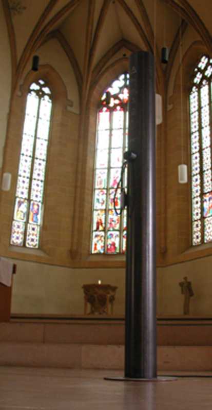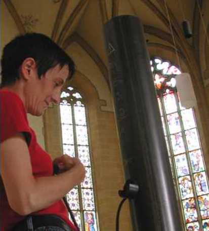 Toutefois il permet seulement de produire des sons, diffusés, amplifiés dans l‘église. Ce qui ressemble au combiné du téléphone est un stéthoscope électronique. Il faut donc l‘appuyer sur le coeur, et notre rythme intime de vie résonne sourdement dans le chœur de l‘église.