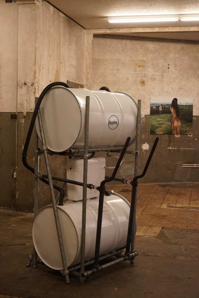 La résistance nécessaire à l'effort est exploitée par 2 pompes, qui transvasent l'eau du tonneau bas à celui d'en haut. Dès qu'il y a de l'eau en haut, elle s'écoule et s'évacue par un mécanisme automatisé de chasse d'eau de WC, qui se déclenche à intervalles d'environ 40 secondes, jusqu'à ce que le réservoir du haut soit vide. La durée de ce vidange est proportionnelle à celle de l'entrainement, environ 15 fois plus long. On entend donc les bruits d'écoulement encore longtemps, même si personne ne s'exerce, et c'est bien sur important.
