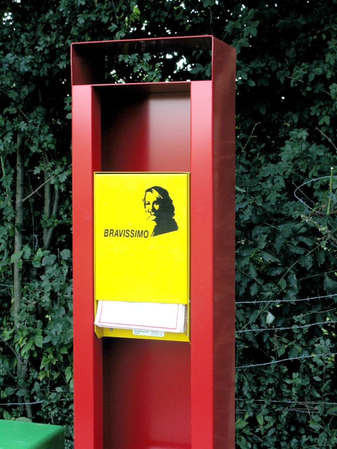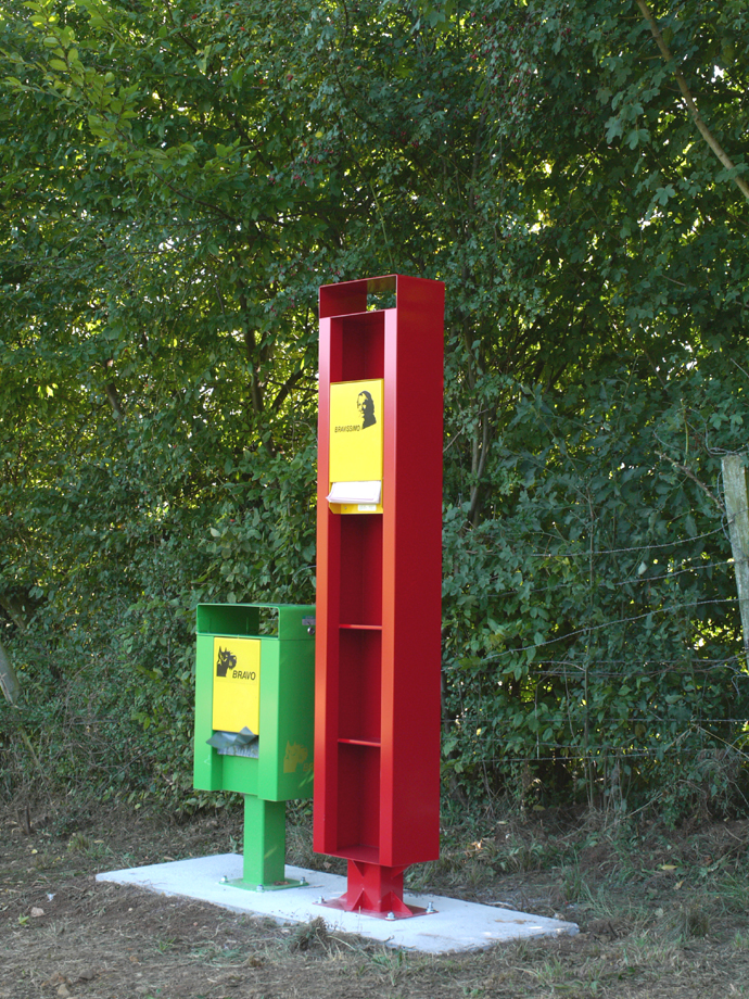 Les promeneurs peuvent se munir de sachets pour recueillir les excréments de leurs chiens (BRAVO), et simultanément d’un autre sachet destiné à conserver toute découverte essentielle (BRAVISSIMO), qui sera ainsi, par sa récolte même, déclaré objet d’art. Qu’ils le déposent ensuite dans la colonne/distributeur ou l’emportent avec eux…